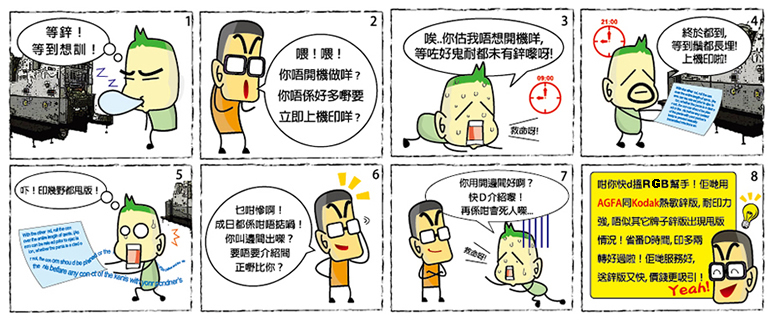 本公司採用全新Kodak Trendsetter 800 Quantum 電腦鋅版機, 具備方形光點技術,此技術是實現精確,穩定印版的保証,溫度補償技術實現套準穩定性,每小時可出輸對開鋅30張,永不停機。我們可以在極短時間內出藍紙,再確認後制作鋅版,整個制作流程比過往縮短幾倍時間,同 時我們有最新的 CIP3,可配合最新的印刷機自動電腦化調校油墨,方便貴司更快更有效的生產,再配合我們的數碼打稿,更可 配合你們的優質色彩。
