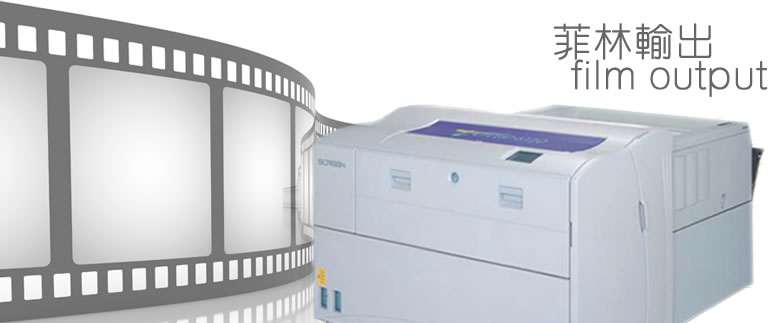 本公司採用先進的Imagesetter,全線採用日本大網屏系統,最高解像度為4000dpi。 「刀神」 SCREEN Tanto 5120 和連線沖機、優質的菲林及藥水去沖印菲林,永不停機。 亦提供不停尺寸的菲林供不同客戶選擇,陰片、陽片,反轉覆片也有提供服務。 我們的專業團隊均有多年經驗及對所有產品及服務為求做到最好,嚴格要求,精益求精。另外每位員工也會使用密度計量度菲林,確保菲林密度及網點準確無誤。